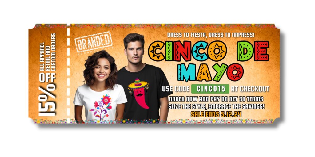 The excitement doesn’t stop there! We’re offering a special Cinco de Mayo promotion! Use the promo code “cinco15” at checkout to receive a 15% discount on your purchase. This also extends to our custom apparel! It’s our way of thanking you for being a part of this celebration and for your continued patronage.